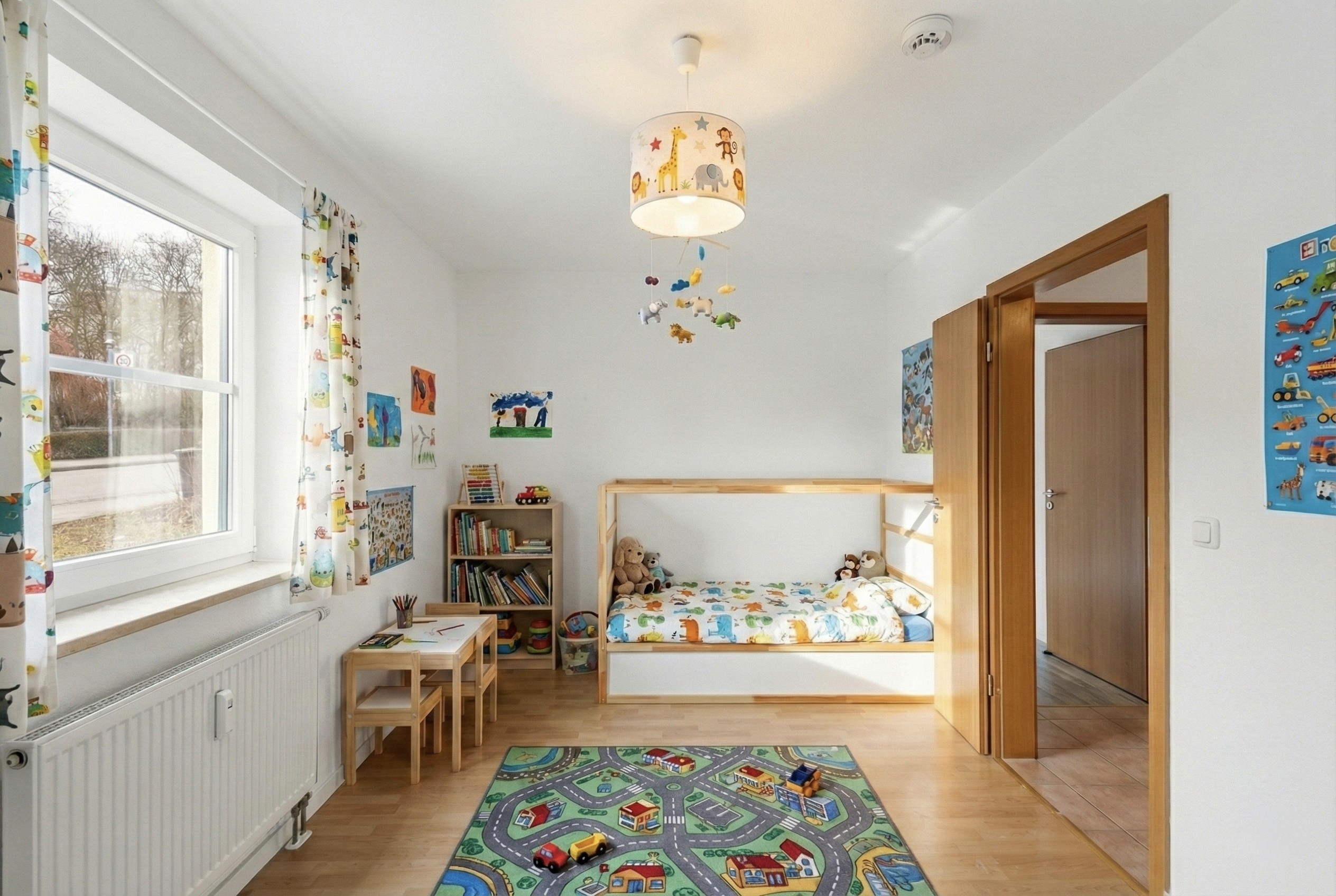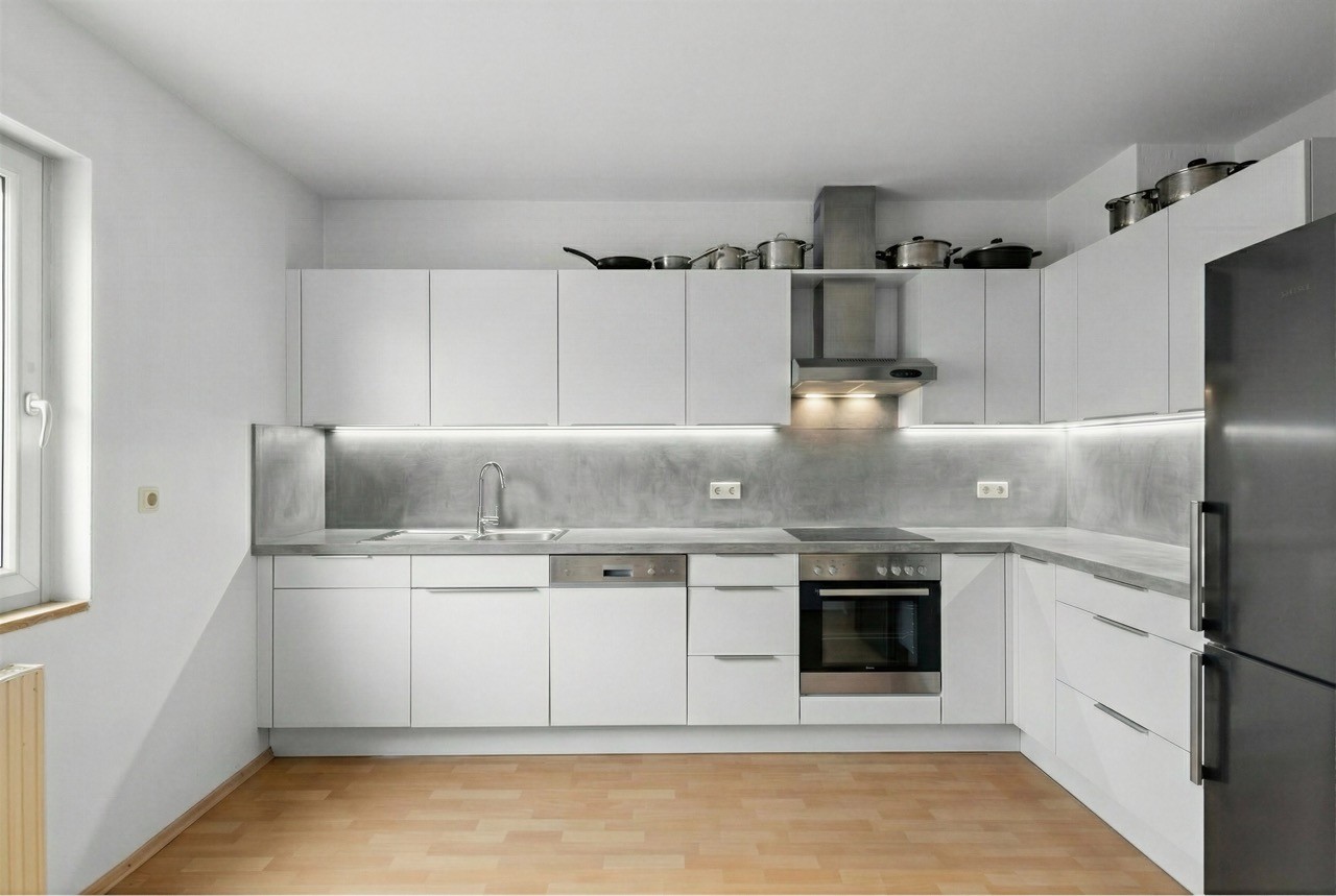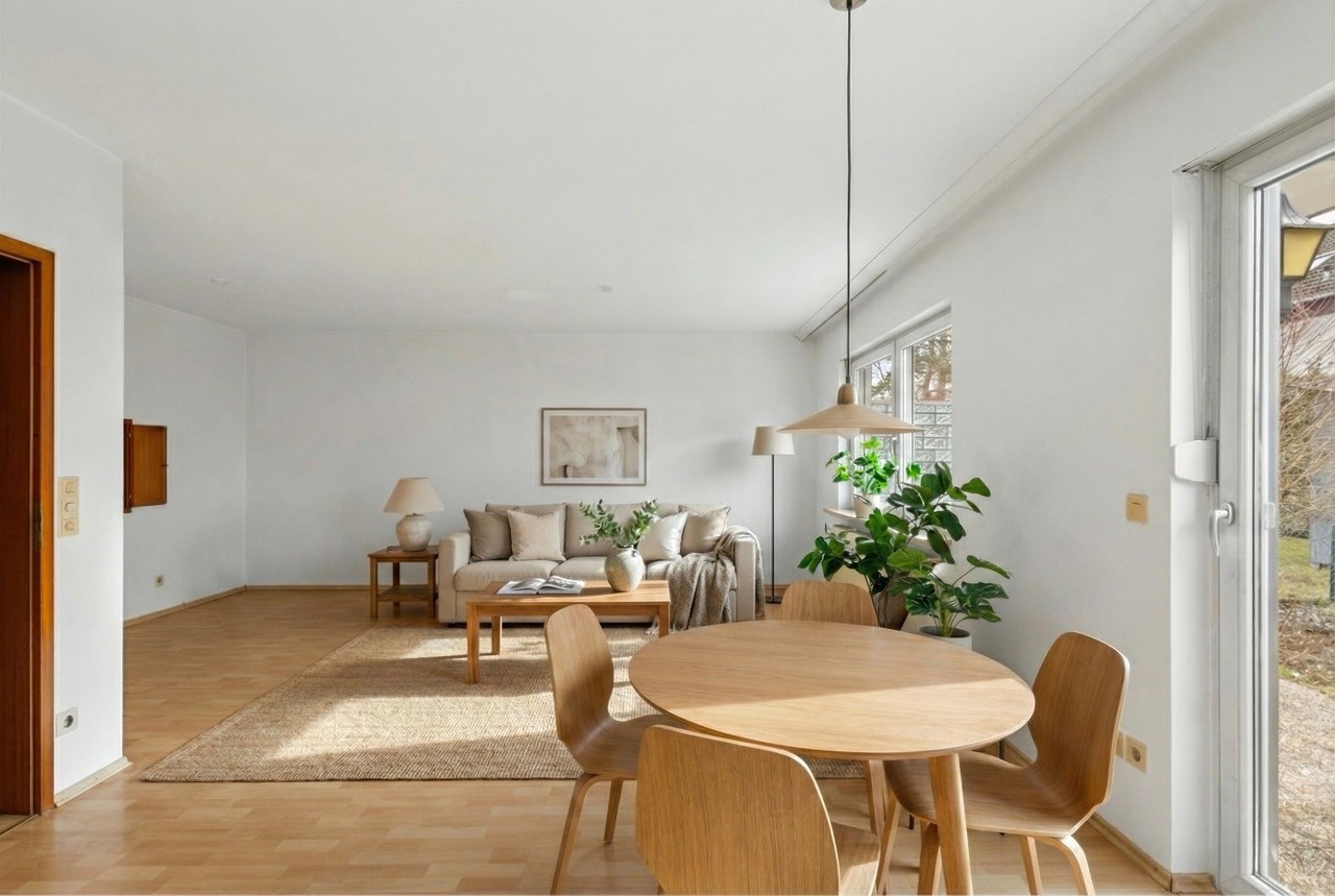Natürliche Materialien, sanfte Farbtöne und ausgewogenes Licht schaffen eine warme und realistische Wohnatmosphäre.