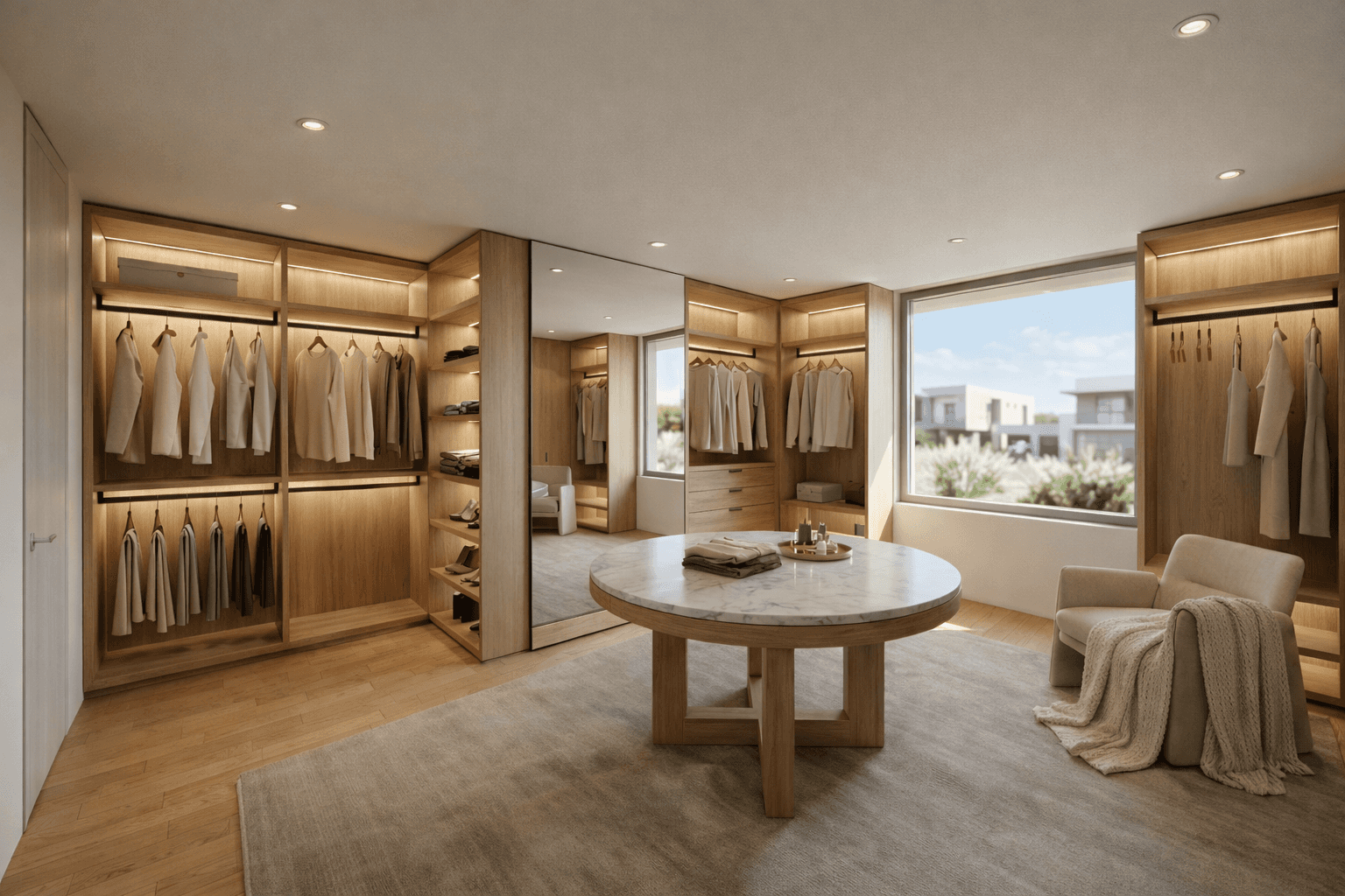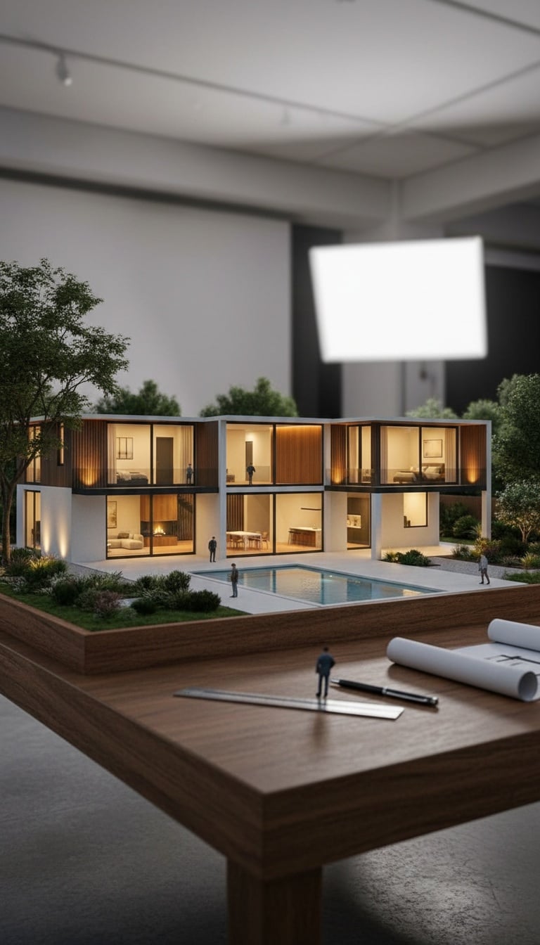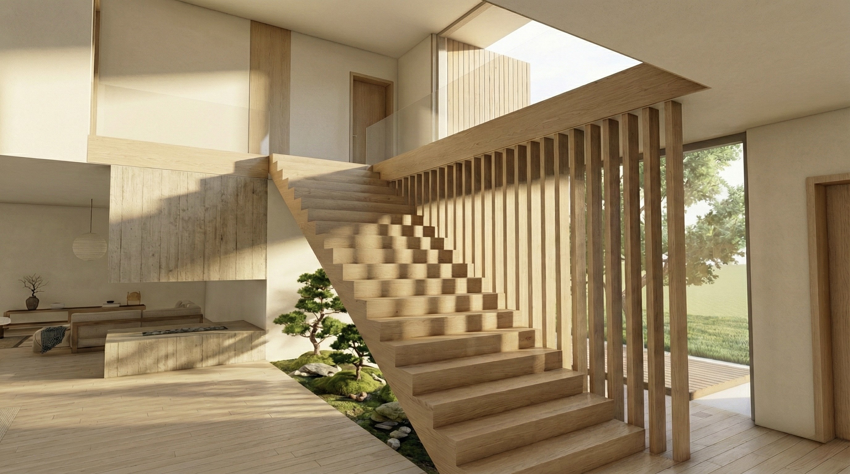Ein vollständig entwickeltes modernes Wohnkonzept, komplett von Grund auf digital entworfen. Architektur, Raumstruktur und Innenräume wurden erstellt, um ein warmes, zeitgemäßes Zuhause zu visualisieren.